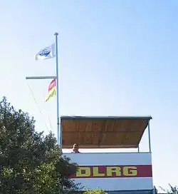 Um Badegästen und Strandbesuchern auf weite Entfernung die wichtigsten Informationen über das Gewässer zu vermitteln, werden an vielen Wasserrettungsstationen und zugehörigen Wachtürmen Flaggen gesetzt. Viele Wasserrettungsorganisationen verwenden dazu ein einheitliches, seit 2008 weltweit durch die ISO genormtes[1] Kennzeichnungssystem. Nach diesem wird ein gekennzeichnetes Badegebiet, das von Rettungsschwimmern bewacht wird, durch Hissen einer rot-gelben Wasserrettungsflagge signalisiert. Zusätzlich kann eine Vereinsflagge (z. B. der DLRG Adler oder das Wasserwachtszeichen) gehisst werden. Wenn die gelb-rote Flagge direkt am Wasser aufgestellt ist, begrenzt sie das Badegebiet. Dass Baden und Schwimmen gefährlich und schwimmen für ungeübte Schwimmer, Kinder und älteren Personen verboten ist, wird durch die obigen Flaggen und einer zusätzlich rein gelben Flagge angezeigt. Baden und Schwimmen generell verboten wird durch eine rein rote Flagge angezeigt. Zur Verdeutlichung können hier alle anderen Flaggen eingeholt werden. Eine schwarz-weiß geviertelte Positionsflagge gibt einen Strandabschnitt zur Nutzung mit Wassersportgeräten (Jetskis usw.) frei. Hier ist Schwimmen verboten.