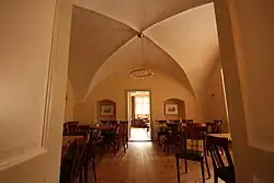 Im Inneren sind Keller, Erd- und Obergeschoss als Kreuzgratgewölbe (Stichkappentonnen) ausgeführt. In der Eingangshalle wird das Gewölbe von einer toskanischen Säule getragen. Dort befindet sich auch ein Renaissancekamin aus dem Jahr 1613, der ursprünglich im Saal im Obergeschoss stand.