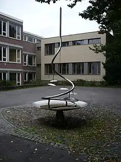 Der Brunnen steht auf dem kleinen zur Malmedyer Straße und Berdoletstraße gelegenen Hof vor der Gemeinschaftshauptschule Burtscheid. Er ist aus Edelstahl gefertigt. Seine Besonderheit ist, dass das aus Düsen des spiralförmig aufsteigenden Rohres zunächst entweichende Wasser beim Zurückfallen auf beckenartige Scheiben trifft und diese zum Klingen bringt.