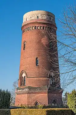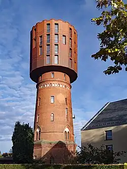 Der Wasserturm in der Schirnerstraße 19 entstand als 38,55 Meter hoher Turm in gotisierenden Formen mit rotem Ziegelmauerwerk und enthält im oberen Teil einen 600 m³ großen Wasserbehälter der Bauart Intze. Im Innern ist er erschlossen durch das Sockelgeschoss, vier durch Holzfußböden eingezogene Zwischenebenen und ein steinernes Obergeschoss, mit einer Treppe verbunden, über dem der Wasserkessel angeordnet ist. Im Inneren des Wasserkessels befindet sich eine Röhre mit einer zum derzeit nicht existenten Dachgeschoss führenden Wendeltreppe.