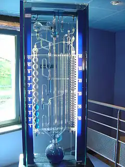 - Der Franzose Bernard Gitton hat eine moderne Wasseruhrkonstruktion entworfen, die er als Horloge à voir le temps couler bezeichnet (etwas frei: „Uhr, bei der man die Zeit fließen sieht“). Bei dieser dient ein wassergetriebenes Pendel als Frequenzgenerator und realisiert über Frequenzteiler sowie Minuten- und Stundenzähler eine diskrete Zeitanzeige. Die Uhr ist weitgehend aus Glas gefertigt und mit gefärbtem Wasser gefüllt. Minuten und Stunden werden am Wasserstand in zwei Säulen abgelesen, die aus verbundenen Glaskugeln bestehen und mit Skalen versehen sind; der Wasserstand in diesen Säulen erhöht sich nicht ständig, sondern im passenden Takt. Gitton hat Uhren dieser Bauart als wissenschaftlich-künstlerische Installationen in zahlreichen Städten in Einkaufszentren, öffentlichen Anlagen und an anderen Orten aufgestellt.[8] In Deutschland befindet sich Gittons 1982 gebaute, 13 Meter hohe Uhr der fließenden Zeit im Europa-Center in Berlin.[9]
