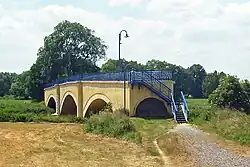 Eine Besonderheit stellt die Überquerung der Mulde dar: In Richtung Leipzig verlaufen zwei Trinkwasser-Rohre – offizielle Bezeichnung: Transportdoppelleitung DN 1000[5] – innerhalb einer 125 Meter langen Dreifeld-Betonbogenbrücke mit Putzgliederung (entstanden um 1912). Seitliche Treppen ermöglichen die Begehung und den Uferwechsel für Fußgänger. Ursprünglich als Straßenbrücke geplant, scheiterte diese Nutzung jedoch am damaligen Gutsbesitzer von Canitz, der die Zustimmung zur Errichtung der Zufahrtsrampen verweigerte. So ist es bei dieser Mulden-Hochbrücke bis heute bei den Treppenaufgängen geblieben.[6]