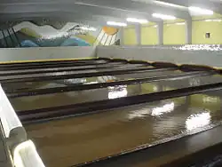 Nachdem das Wasser die Accelatoren verlassen hat, wird ihm Kalkhydrat zugegeben. In der Filterhalle wird es über offenen Filterkies geführt. Dabei werden Reste von Huminstoffen und Eisen entfernt. Durch Mikroorganismen wird Ammonium zu Nitrat gewandelt. Mangan wird abgeschieden. Die Reinigung ist abgeschlossen.