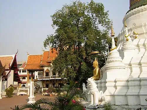Die in einem Garten gelegene Chedi des Tempels ist eine Mischung aus Mon- und burmesischer Architektur. Sie ist über 400 Jahre alt, im Jahr 1958 wurde sie renoviert. Früher soll sie auch Reliquien des Buddha enthalten haben. Ihre Basis, bewacht von vier Chinthe, burmesischen Löwen, dem Gegenstück zu den thailändischen Singha, ist in weißer Farbe getüncht, die höheren Abschnitte jedoch mit einer Kombination als Blattgold und Glasmosaiken geschmückt. Ihre Spitze ist von einem Hti (Schirm) gekrönt.