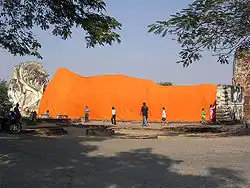 Die riesige liegende Buddha-Statue ist die Hauptattraktion dieses Tempels. Sie ist etwa 40 Meter lang und 8 m hoch und besteht aus Ziegeln und Mörtel. Die Statue liegt nicht wie üblich in Ost-West-Richtung, sondern in Nord-Süd-Richtung. Der Kopf liegt auf vier Lotos-Knospen und wird von der rechten Hand abgestützt.