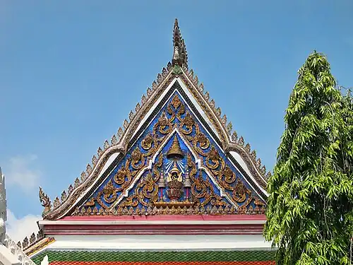 - Wihan – Das Giebelbrett ist reich verziert mit dem Symbol von König Mongkut: der Krone. Dieses Symbol findet sich ebenfalls an den Umrandungen der Fenster und Türen wieder.