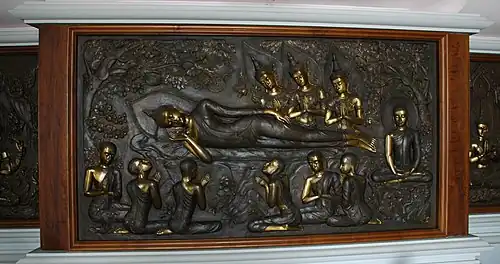 Der Sockel, auf dem die Buddhafigur rastet, ist umgeben von großformatigen Platten aus getriebenem, teilweise feuervergoldeten Kupferblech, auf denen Szenen aus dem Leben Buddhas dargestellt sind. Auch die wuchtigen bronzenen Eingangstüren an allen vier Seiten der rechteckigen Halle sind mit ähnlichen Reliefs versehen. An den Innenwänden sind zwischen und oberhalb der Fenster in Holzschnitzarbeit ausgeführte Reliefs angebracht. Der Buddha liegt auf einem aus dem gleichen Material gehauenen Kissen, hat weiche Gesichtszüge und ist in einzigartiger künstlerischer Qualität erarbeitet.