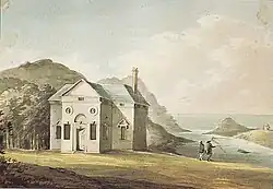 „Vom Gipfel einer hohen Landspitze, an deren Rand wir entlang zogen, stieg ich nach Watermouth hinab, dessen Anblick so einzigartig wie erhebend war. All diese Gründe waren in einem kleinen Raum umschrieben, der aus ein paar Feldern bestand, die zum Haus gehörten, bestand und einer Halbinsel, die, als sie zwischen den Wassern der Bucht und der See eingeschlossen wurde, zuerst eine gewisse Breite hatte und guten Weidegrund darstellte. Diese aber zog sich bald zusammen und wurde nach und nach schmäler, nach Westen in der Länge begrenzt durch einen felsigen Punkt, der sich gegenüber einer weitläufigen Klippe, die auf der anderen Seite steil und felsig abfiel, in die See traute und so die Mündung einer kleinen Bucht, deren Schönheit und Einzigartigkeit der Stolz dieses Ortes waren. An diesem Punkt war sie sehr schmal; der Raum zwischen den felsigen Barrieren weitete sich aber auf, je weiter man sie landeinwärts verfolgte und war an ihrem Ende am breitesten, wo man eine Reihe von Fischerhütten sehen konnte und wo auf einem weiter entfernten, erhöhten Hügel der Sitz von Mr Davie platziert war. Die vorhergehende Skizze erklärt die Natur dieser Bucht und der Landspitzen, die sie einschließen, besser und sie vermittelt einen genaueren Eindruck der Lage und Architektur des Hauses. Dieses aber fand ich in einem verfallenen Zustand, in den es absichtlich mit Blick auf seine Erweiterung gebracht worden war. Ich hatte gerade die groben Umrisse davon fertig, als mir ein Diener die Komplimente seines Herren überbrachte und mich bat, an dem Dinner teilzunehmen, das auf dem Tisch stand. Es war drei Uhr, ich akzeptierte die Einladung, da es eilte, und folgte dem Diener zur Fischerhütte hinunter, wo Mr Davie (während des Umbaus seines Hauses) seinen zeitweisen Aufenthalt genommen hatte. Ich wurde freundlich und höflich aufgenommen. Am Abend, als wir unseren Wein getrunken hatten, begleiteten er und sein Bruder mich zum Haus, das, wie ich feststellte, nur noch einiger Ergänzungen bedurfte, deren größte zwei Bogenfenster an der Nord- und Südfassade waren; dies waren die Haupträume, Salon und Speisezimmer. Sie waren zur Zeit klein und nach dem vorgeschlagenen Plan schien es, dass sie nicht nur vergrößert, sondern auch der Ausblick verbessert werden sollte. Fast der einzige Ausblick, den von den Fenstern hatte, ging auf die Bucht und ihre unmittelbare Umgebung, aber dazu würde nun auf der Nordseite ein weiter Ausblick kommen; man würde die ganze Combemartyn-Küste überblicken können, insbesondere der spitze Hügel, den ich fast einen Berg genannt hätte, bevor ich ihn unter dem Namen Hangman's Cliff notierte. Es gab eine gewisse Großartigkeit hier, die sich der Erhabenheit annäherte und die, da sie sich in erheblichen Gegensatz zum Blick auf die Bucht befand, nicht umhin konnte, das Auge eines Mannes mit Geschnack, wie es mir Mr Davie zu sein schien, anzuziehen. Tatsächlich erschien mir die Einführung dieses schönen Punktes in die Ausblicke vom Haus von der ersten Konsequenz zu sein und es erstaunte, dass das ganze Haus in dieser Richtung leer gewesen sein sollte. Das ursprüngliche Gebäude war für sich betrachtet klein und einfach, in der Art, dass es eine Art mönchischen Gang unter der Erde hatte, wo die Büros angeordnet waren und um den herum es sich in einer Vielzahl labyrinthischer Kurven wand. Anhand eines Planes von Lord Clinton[6] (wie mir Mr Davie sagte), der ein Verwandter der Familie war, wurde es erbaut. Dieser Herr wurde auf seinen Reisen so vom griechischen Architekturstil gefesselt, dass er, als er nach England zurückkam, geradezu von einer Bauwut gepackt wurde und davon, seine Landsleute im Westen in Beispiele der eleganten Tempel und Bauten, die er im Ausland gesehen und bewundert hatte, einzuführen. Vitruv und Palladio waren die Großmeister, und aus ihren Modellen entstanden die Tempel von Castle Hill, seiner Residenz, und das kleine Landhaus in Watermouth. In der Umgebung von London treffen wir nicht selten auf Landsitze von solcher Form, aber zumindest unsere Überraschung ist hervorgerufen, wenn wir mitten in einem solch wilden Land diese Art von Architektur erblicken. Man hätte eher erwartet, ein altes, gotisches Landhaus zu erblicken, da dies dem Land und der romantischen Lage von Watermouth eher angepasst ist.“