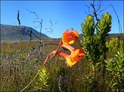 - Watsonia rourkei Goldblatt: Dieser Endemit ist nur von einem Fundort im Kamiesberg im Namaqualand im Nordkap bekannt. Er gedeiht in saisonalen Wasserläufen im montanen Renosterveld in einer Höhenlage von etwa 600 Meter. Dieser Fundort ist nicht gefährt und der Bestand gilt als stabil. Sie wird 2006 in der Roten Liste der gefährdeten Pflanzenarten Südafrikas als „Critically Endangered“ = „vom Aussterben bedroht“ bewertet.[3]