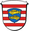 Blasonierung: „In Silber vier rote Balken mit zwei goldenen, im Gegenbewegungssinn übereinander gefügten Fischen in aufgelegtem blauen Herzschild.“