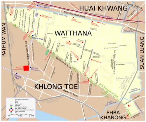 Die benachbarten Bezirke sind im Uhrzeigersinn von Norden aus: Ratchathewi, Huai Khwang, Suan Luang, Phra Khanong, Khlong Toei, Sathorn und Pathum Wan.
