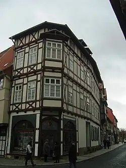 Das dreigeschossige Fachwerkhaus entstand im Jahr 1860. Die Fachwerk präsentiert sich schlicht. Als Verzierung bestehen an den Brüstungen Andreaskreuze. Einige Andreaskreuze nehmen die Höhe eines Stockwerks ein. Markant ist der zur Straßenecke zeigende, sich über das erste und zweite Obergeschoss erstreckende Erker. Das Haus verfügt über einen Kniestock. Im Erdgeschoss erfolgte ein Ladeneinbau. Die Schaufenster sind mit reichem Schnitzwerk aus Flechtband und Rosetten umrahmt.