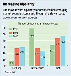 Zwischen 1990 und 2004 ist die Zahl der Länder, die zu einem völlig flexiblen oder extrem rigiden Wechselkursregime übergegangen ist, stark angestiegen. Der Anteil unter den IWF-Mitgliedsländern ist von etwa einem Drittel auf etwas mehr als die Hälfte angestiegen. Als Hauptgrund dafür gilt bzw. galt, dass man die beiden Extremformen als krisenresistenter ansah als die Zwischenformen.[7]