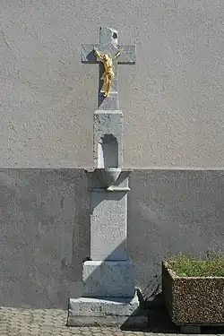 Das etwa 3,50 m hohe Blausteinkreuz hat einen gestuften Sockel. Auf dem Pfeilerschaft ist eine Inschrift zu lesen. Der Kreuzesfuß ist als Rundbogennische ausgebildet. Der Korpus am Kreuz besteht aus Gusseisen.