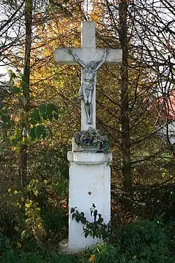 Das Steinkreuz wurde in der zweiten Hälfte des 19. Jahrhunderts errichtet. Es besteht aus Buntsandstein und ist mit Binderfarbe angestrichen. Das Kreuz besteht aus einem Pfeiler mit Konsole, darauf ein hohes Kreuz mit gusseisernem Korpus.