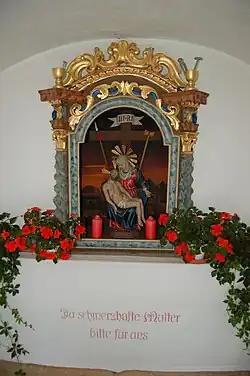 Im Inneren findet sich ein hölzernes Altärchen mit blaugrauer Marmorfassung und vergoldeten Ornamentteilen. Das Altarretabel stammt aus dem 18. Jahrhundert und besteht aus gedrehten Säulen und einem flachbogigen Giebelabschluss. Die hölzerne Pietà befindet sich vor einem gemalten Landschaftshintergrund.