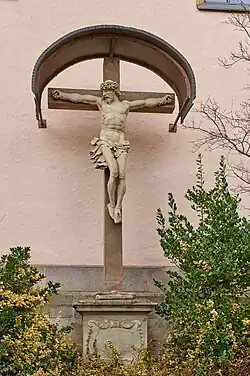 Das 380 cm hohe Wegkreuz befindet sich an der Ostfront der Kirchenmauer. Es besteht aus gelbem Sandstein und entstand im Jahr 1753.