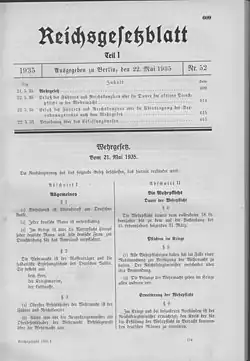 - ↑ Wehrgesetz. vom 21. Mai 1935. Im Reichsgesetzblatt, Teil I Nr. 52 vom 22. Mai 1935, S. 609 ff., Digitalisat.