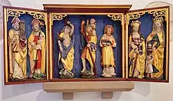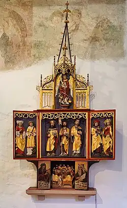 Die Bedeutung der Kirche im Spätmittelalter spiegelt sich auch in den drei erhaltenen mittelalterlichen Flügelaltären wider. Das Retabel auf dem Hauptaltar im Chor ist auf das Jahr 1447 datiert und wurde 1910 und letztmals 1982 restauriert. In der Predella ist ein Relief mit Christus inmitten der zwölf Apostel, der Mittelschrein ist mit farbig gefassten Schnitzfiguren versehen, die Farbfassung erfolgte vermutlich nach Befund im Jahr 1910. In spitzbogigen Öffnungen mit Blendmaßwerk ist eine Strahlenkranzmadonna flankiert von den Kirchenpatronen Nikolaus und Leonhard zu sehen. Die Seitenflügel zeigen in feiner Tafelmalerei auf Goldgrund links Heinrich II. und Kunigunde, rechts Laurentius und Sebaldus. Die Rückseiten der Flügel zeigen links Sigismund von Burgund und Petrus, rechts Andreas und Johannes den Täufer. Im unteren Bereich sind die Stifter dargestellt, links, dem Wappen nach der Patrizier Sigismund I. Fürer von Haimendorf, welcher im Thüringer Wald Erzbergbau und Saigerhüttenbetriebe unterhielt. Rechts ist mit dem Handelszeichen im Wappen sein Faktor dargestellt. Auf Grund der herausragenden Stellung als Kaufmann und Ratsangehöriger in Nürnberg ist anzunehmen, dass der Altar dort, eventuell sogar in einer bedeutenden Werkstatt (möglicherweise vom Meister des Tucheraltars?) gefertigt wurde. Auf dem Schrein ist eine freistehende Kreuzigungsgruppe zu sehen, die Rückseite ist weniger kunstfertig mit der Gregorsmesse gestaltet, darunter das Schweißtuch Christi. Der Seitenaltar an der Chornordwand ist ein Flügelaltar, der 1982 restauriert wurde. Die Predella mit Abendmahlsrelief und seitlichen bemalten Flügeln zeigt links David, rechts Moses. Im Schrein sind Schnitzfiguren zu sehen: Johannes der Täufer, links Jakobus der Ältere und rechts Leonhard; in den Seitenflügeln links Magdalena und Cyriakus, rechts Veit und Margarete. Im geschlossenen Zustand zeigen beide Flügel zusammen den heiligen Georg im Kampf mit dem Drachen. Ein Maßwerkaufsatz ist mit der Schnitzfigur des Erzengels Michael mit der Waage ausgestattet.