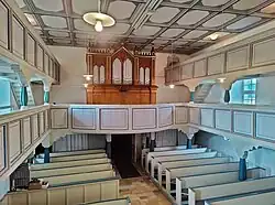 Der Innenraum ist flachgedeckt, im Schiff sind zweigeschossige Emporen eingebaut. Im oberen Bereich der Chornordwand wurden Reste eines Wandmalereizyklus freigelegt (möglicherweise eine Verkündigung), die vermutlich im Zusammenhang mit dem Umbau im 15. Jahrhundert entstanden sind.