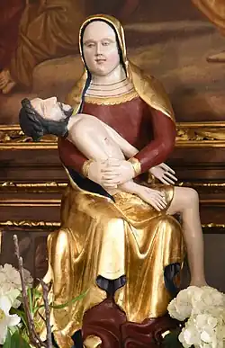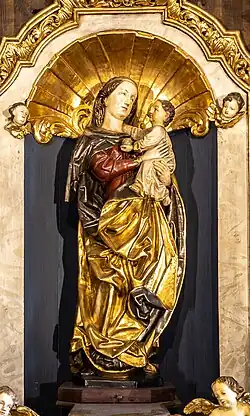 Auf der rechten Seite des Langhauses ist über den Beichtstühlen eine Skulpturengruppe der Heiligen Drei Könige in Holz zu sehen, gefertigt im Rahmen der barocken Erweiterung um 1730. Auf der Empore befindet sich eine romantische Orgel, welche im Jahr 1884 von der Firma Josef Bittner aus Nürnberg eingebaut wurde. Die Orgel besteht aus 18 Registern.[14] Die Deckengemälde wurden im Jahr 1975 durch den Kunstmaler Michael Weingärtner aus Pfaffenhofen geschaffen. Sie zeigen die Motive „Die Krönung Mariens mit Wehrkirche“, „Das Abendmahl“ und „Wiederkehrender Christus“.[15][16][17]