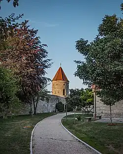 Der gotische 52 Meter hohe Kirchturm hat vier Stockwerke und ein eindrucksvolles Spitzdach. Als Fünfknopfturm mit vier Scharwachttürmen auf den Ecken ist es ein regional typischer Verteidigungsturm des frühen 15. Jahrhunderts.[13]