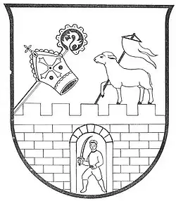 Im oberen Feld finden sich zur Linken die Insignien des Bischofsamtes, die Mitra und der Bischofsstab, und in der rechten Ecke die Versinnbildlichung des Lamm Gottes; auf diese Weise verbinden sich im Wehrsdorfer Wappen klerikale und säkulare Elemente.