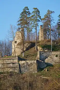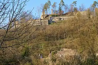 ![]() Die heutige Ruine der Burg Wehrstein, Blick von Fischingen | ||