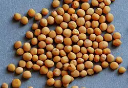 Die reifen Samen enthalten etwa 30 % Öl und Sinalbin. Der Sinalbingehalt der Senfkörner wird mit 155 bis 250 μ mol / g[20][21] und 16,6 bis 46,2 g / kg angegeben.[22] Es gehört zu den Senfölglykosiden und sorgt für die Schärfe im weißen Senf. Ähnlich wie beim Sinigrin wird nach Hydrolyse durch das Enzym Myrosinase ein scharf schmeckendes Senföl – hier 4-Hydroxybenzylisothiocyanat – freigesetzt.