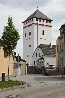Nordwestseite des Turms, links bei dem Baum der Grenzstein zwischen Kurtrier und Kurköln