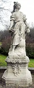 Zur Parkseite schließt sich eine Terrasse von nahezu Gebäudebreite an. Von dieser führen sechs Stufen auf eine weitere halbrunde Terrassenfläche hinab. Diese wird von sechs dem Hause zugewandten Statuen auf Sockeln umstanden, die in Lebensgröße griechische Musen darstellen, denen im Laufe der Jahre allerdings einige ihrer Attribute abhandengekommen sind. Die Musen sind Euterpe, Urania, Polyhymnia, Erato, Melpomene und Thalia.[2] Es sind Kopien der von Johann Wolfgang van der Auwera für den Schlosspark Veitshöchheim angefertigten Barockstatuen. Die Kopien hatte um 1890 der Bildhauer Fritz Walter Kunze für eine Herfurthsche Besitzung in Prödel geschaffen.