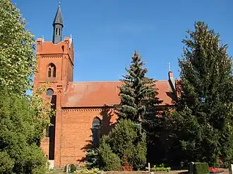- Die evangelische Dorfkirche Weißewarte auf dem Ortsfriedhof wurde 1848 als neugotischer Backsteinbau errichtet. Vorher stand an der Stelle eine barocke Fachwerkkirche.[33] In den 2000er Jahren fanden Sanierungsarbeiten statt. So wurde das Kirchendach erneuert, eine neue Turmspitze aufgesetzt, eine Winterkirche eingebaut und das Fenster mit einem Christusmonogramm repariert.