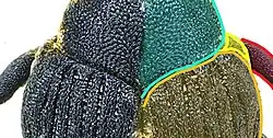 | Abb. 12: Ausschnitt Oberseite, rechts koloriert; türkis: Halsschild, gelb: Epi- mer der Mittelbrust, rot: mittleres rech- tes Bein, ocker: Flügeldecken | |||||||