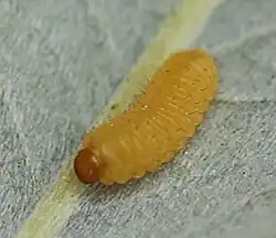 Die 4 mm lange beinlose, dottergelbe Larve besitzt eine rotbraune Kopfkapsel. Reihen kleiner abstehender Härchen verlaufen längs der Oberseite des Körpers.