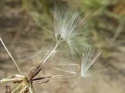 Die hellbraunen Achänen sind 7 bis 8 Millimeter lang, beiderseits sieben- bis achtrippig und auf den Rippen im oberen Teil mit feinen Stachelborsten besetzt.[4] Der Schnabel ist weiß[4] und eineinhalb- bis dreimal so lang wie der untere Teil der Frucht.