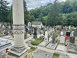 Der Weidlinger Friedhof liegt zwischen der Lenaugasse und dem Rotgrabenbach, einem Nebenbach des Weidlingbaches. Er weist mehrere bemerkenswerte Grabdenkmäler aus dem Biedermeier und dem Historismus auf. Der Bildhauer Leopold Kiesling schuf das monumentale Granit-Grab des Diplomaten und Orientalisten Joseph von Hammer-Purgstall bereits zu dessen Lebzeiten um 1820. Es weist Inschriften auf Arabisch, Deutsch, Englisch, Französisch, Griechisch, Italienisch, Lateinisch, Persisch, Spanisch und Türkisch auf.[1] Das Grabmal des Unternehmers und Politikers Franz Löblich ist ein Frühwerk des Architekten Robert Oerley aus dem Jahr 1898.[2]