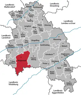 ![]() Lage der Gemeinde Weigendorf im damaligen Landkreis Dingolfing
