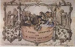In London beauftragte Sir Henry Cole im Dezember 1843[1] den Illustrator John Callcott Horsley, für ihn eine Weihnachtskarte mit dem Text Merry Christmas and a Happy New Year to You zu kreieren. Horsley ließ sich durch die Form eines Altarbildes inspirieren und komponierte das Bild eines Familienfestes in der Größe von 5,7 × 3,3 Zoll, umrahmt von Zweigen und Reben, die dem Betrachter Fröhlichkeit und Wohltätigkeit vermittelten. Sir Henry Cole, der eine eigene Lithographenanstalt besaß, druckte von diesem Motiv 1000 Karten in einer handkolorierten Auflage und verkaufte diese zu dem damals horrenden Preis von 1 Shilling pro Stück. Bei einer Auktion im November 2001 wurde eine dieser Karten zum Rekordpreis von 22.500 Pfund versteigert[2].