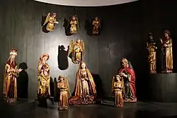 - drei Weise aus dem Morgenland (Caspar, Melchior, Balthasar) mit Geschenken (Gold, Weihrauch und Myrrhe); in der Regel symbolisieren sie die drei Lebensalter und drei Kontinente (meist steht Balthasar für Asien und überbringt Weihrauch, Melchior wird als greiser Europäer und Überbringer des Goldes dargestellt, Caspar als dunkelhäutiger Jüngling, Myrrhe überreichend und Afrika symbolisierend). Es gibt aber auch abweichende Interpretationen, in denen sowohl Balthasar als auch Melchior als dunkelhäutig betrachtet werden.[2]