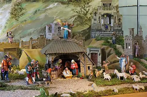 Eine Weihnachtskrippe ist eine Darstellung der biblischen Weihnachtsgeschichte mit Menschen-, Engel- und Tierfiguren, teilweise nur mit offenem Krippenstall, teilweise in einer aufwändigen Modelllandschaft. Diese ist meist an nicht historischen orientalischen Bezügen orientiert und soll die Gegend von Bethlehem darstellen. Die oft in den Alpen lebenden Schnitzer haben aber auch ihre Heimat adaptiert und sogenannte Alpenländische Krippen gestaltet, gleiches gilt bspw. auch für die Santons der Provenzalischen Krippen, die mit regionaltypischen Accessoires ausgestattet sind. Der Mittelpunkt ist die Krippe, in der Jesus Christus als neugeborenes Kind liegt. Im Deutschen steht der Begriff Krippe deshalb als pars pro toto für das ganze dreidimensionale Weihnachtsbild.[1] Viele Weihnachtskrippen verbinden die Bilderwelt der Adventszeit mit jener des Dreikönigsfests. In einem erweiterten Sinn können auch andere Modelllandschaften mit Szenen aus dem Leben Jesu als Krippen bezeichnet werden.