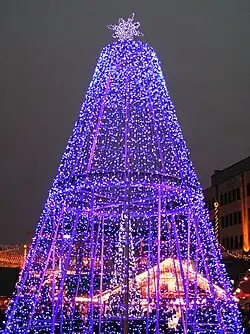 Christkindlmärkte lassen sich in der Vorweihnachtszeit in vielen Stadtteilen und Landkreisgemeinden finden. Im Jahr 1310 wurde in München ein Nikolausmarkt erstmals urkundlich erwähnt. Neben dem umfangreichen musikalisch-kulturellen Begleitprogramm gehört zu seinen Attraktionen der fast 30 Meter hohe Christbaum vor dem Rathaus mit rund 2.500 Lichtern, der jedes Jahr von einer anderen Ortschaft aus dem In- oder Ausland (Österreich, Italien) den Münchner Bürgern gespendet wird.[41] Der Markt hat üblicherweise vom Freitag vor dem 1. Adventssonntag bis zum Heiligen Abend täglich geöffnet.