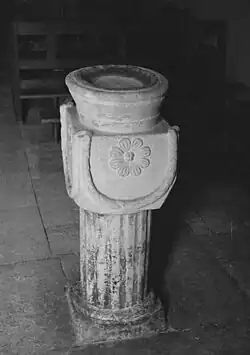 Das Weihwasserbecken aus Stein besteht aus drei Teilen: einer quadratischen Basis mit einer kannelierten Säule, einem quadratischen Unterbau für das Becken, der mit einem umlaufenden Kordel-Ornament und auf drei Seiten mit einer Margeritenblüte verziert ist. In die vierte Seite ist die Jahreszahl 1787 einskulpiert. Darauf steht das runde Becken, das mit einem Wulst abschließt.