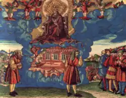 - CVIIr[14] Salomos Tempel mit den beiden freistehenden Säulen Jachin und Boas und einem Wendelstein als auffälligem architektonischem Element, vgl. Luthers Übersetzung 1 Kön 6,8: „EJne Thür aber war zur rechten seiten mitten am Hause / das man durch Wendelstein hinauff gieng auff den Mittelgang.“