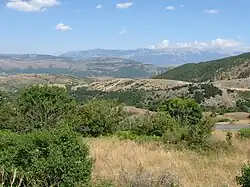 33. Paolos Blick von Pietrasecca aus: Kranz der Berge rund um das Fucino-Becken, Hügel, die die Vorstufe der Berge bilden, Straße zwischen Weinbergen und Feldern langsam bergab (Kap. 28)