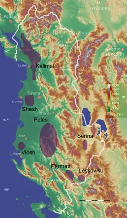 Zu den wichtigsten Weinherstellungsgebieten gehören diverse traditionelle, mehrheitlich katholische Regionen rund um Shkodra (zum Beispiel das Dorf Kallmet), die Hügel rund um die Hauptstadt Tirana (zum Beispiel das Dorf Lundër), vor allem auch die Region von Berat sowie die Regionen Durrës, Korça und Lushnja.[2] In küstennahen Gebieten wurde Wein oft in der Ebene angebaut, im Süden zum Teil auch auf künstlich angelegten Terrassen.[7]