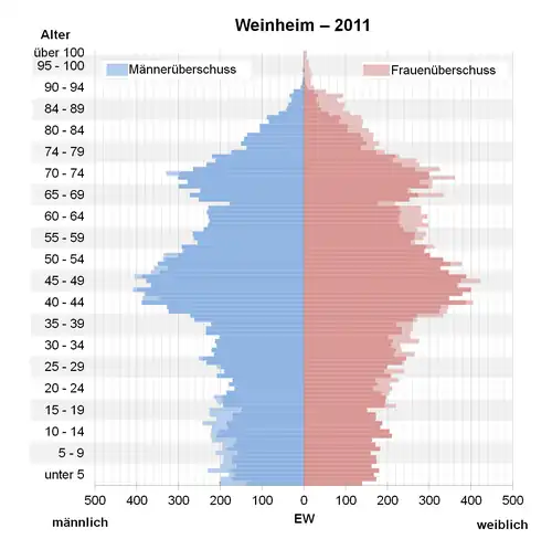 - ↑ Datenbank Zensus 2011, Weinheim, Alter + Geschlecht