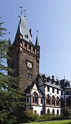 Schlossturm und Zwischenbau wurden 1868 im Stil der Neugotik durch Freiherr Christian Friedrich Gustav von Berckheim (1817–1889) errichtet. Vorausgegangen war der Abbruch des Kellereiflügels des kurpfälzischen Schlosses. Der 39 Meter hohe Schlossturm, der dem Blauen Turm in Wimpfen nachempfunden wurde, zeigt neugotische Architekturelemente. Christian legte auch den noch heute bestehenden und der Öffentlichkeit zugänglichen Exotenwald unweit des Schlosses an. Das Schloss zeichnet sich noch heute durch die Vielfalt der verschiedenen Baustile aus.