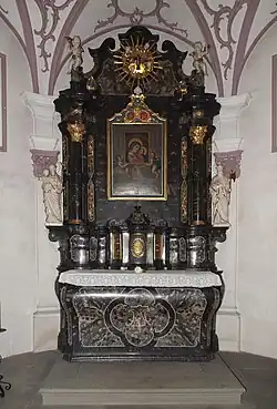 Der Hauptaltar ist ein durch zwei Säulen gegliederter Rokokoaltar, bestehend aus Marmor und marmoriertem Holz. Es ist kein Meister am Altar verzeichnet, eine eindeutige Zuordnung ist daher nicht möglich. Der Altar stammt aber mit grösster Wahrscheinlichkeit von einem zu der Zeit in Baar und Frauental tätigen Tiroler Meister und beherbergt das 1762 für die erste Kapelle gestiftete Bild. Auf dem Rahmen findet sich das Datum 1797 und das Allianzwappen Baumgartner-Lutzinger. Seitlich neben den Säulen stehen die beiden Statuen des St. Josepf und St. Mathias, die heute durch Kopien ersetzt sind (Originale sind erhalten). Über den Säulen sind zwei Putten angebracht, dazwischen befindet sich der geschweifte Giebel mit einem Okulus mit Wolken und Strahlenkranz sowie die Heilig-Geist-Taube. Das Okulus wird durch ein rundes Fenster hinterleuchtet.