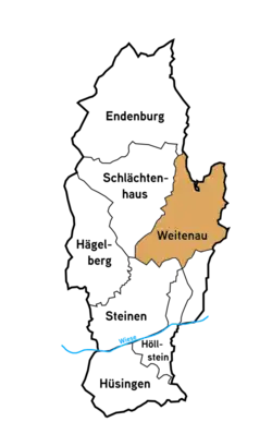 - ↑ Siehe Badisches Wörterbuch, Band I, S. 77 ‚Au‘, dort wird auch Weitenau als Beispiel dieser Namensbildung erwähnt.