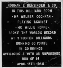 1945 stellte Cochran in einem Dreibandspiel gegen Hoppe einen neuen Weltrekord von 3,000 im Einzeldurchschnitt (ED) auf. Er spielte 60 Punkten in 20 Aufnahmen.